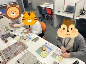 本日から初めての模擬就労ということで、他の社員からいろいろと業務を教わったりして、本日は新聞紙でのごみ箱作りに参加していました。