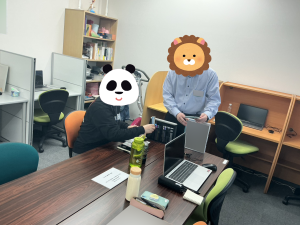 事務広報課には、新しいメンバーのH.A社員が本日から事務広報課の業務を学ぶということで、先輩のO.N社員からブログで使う写真の撮影、修正の仕方を学んでいる様子でした。